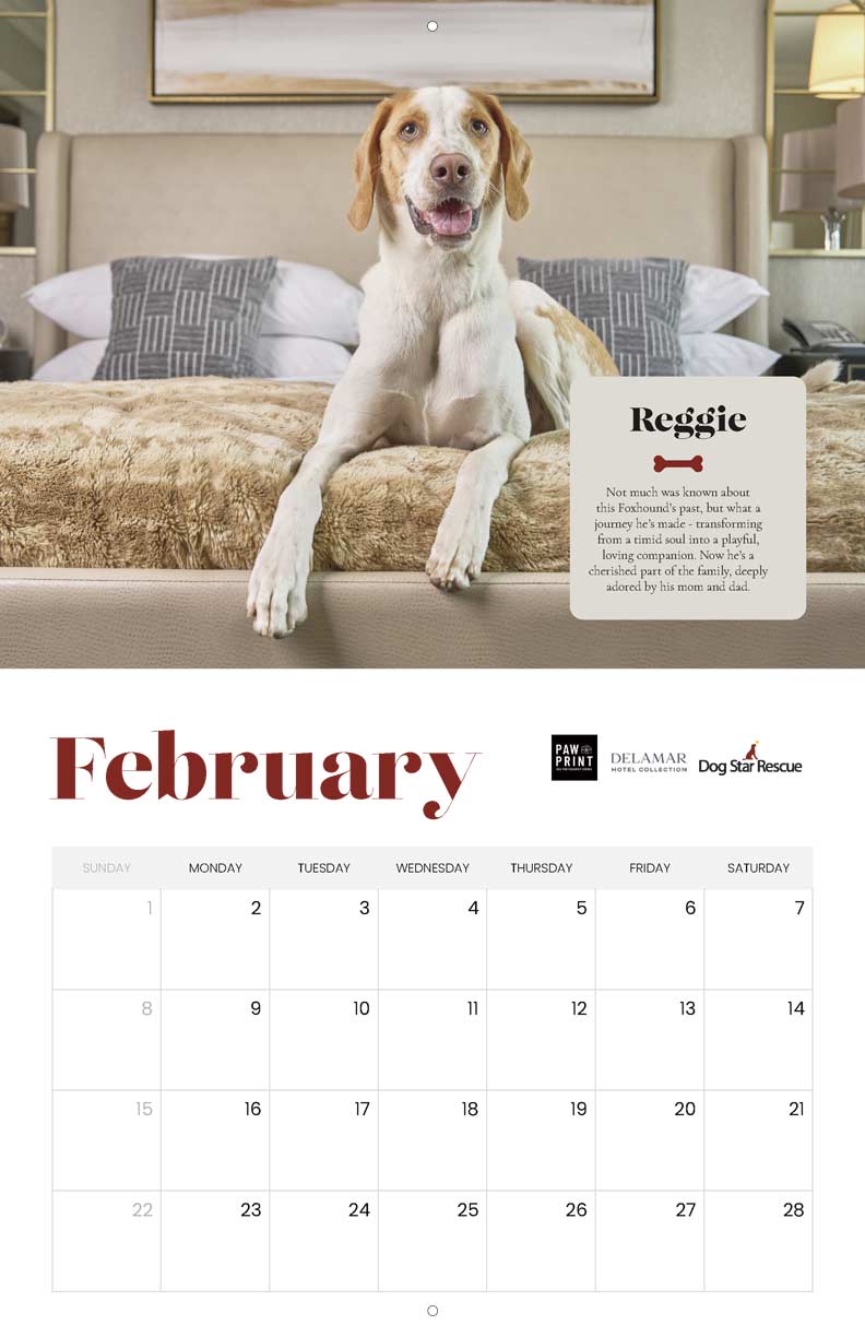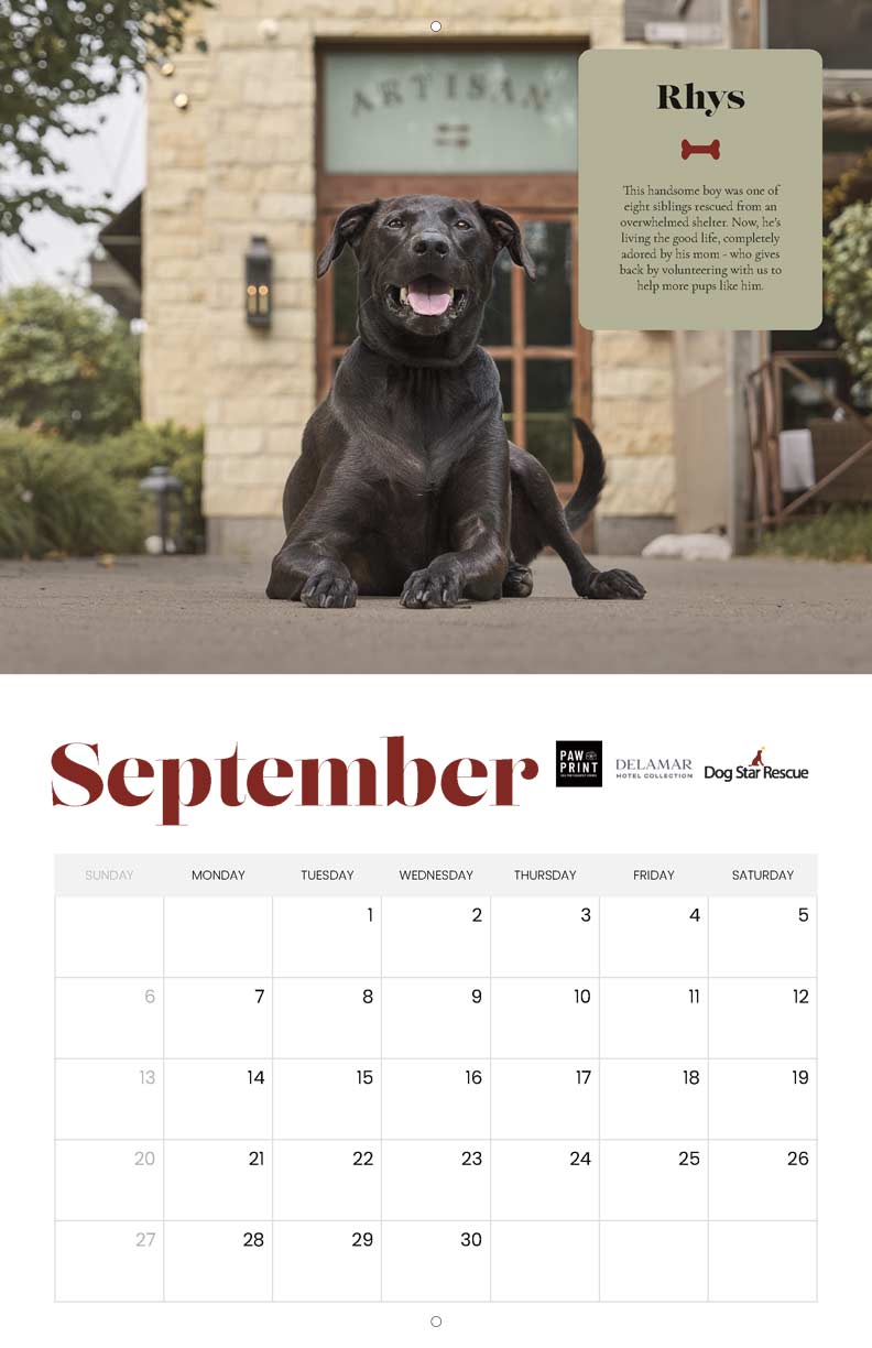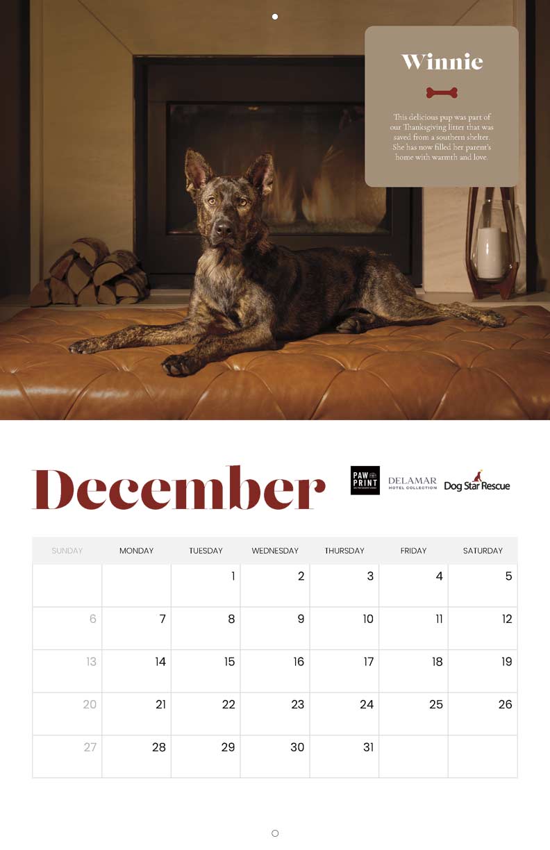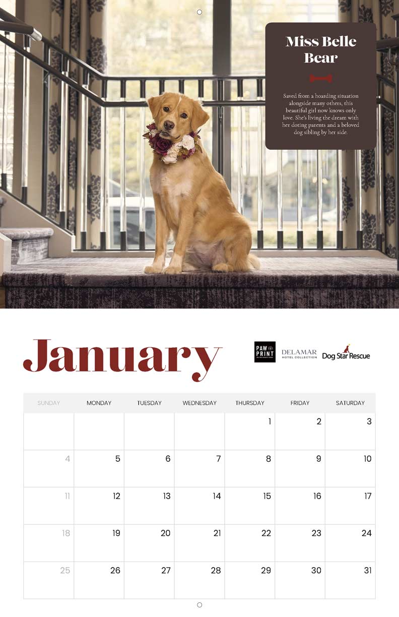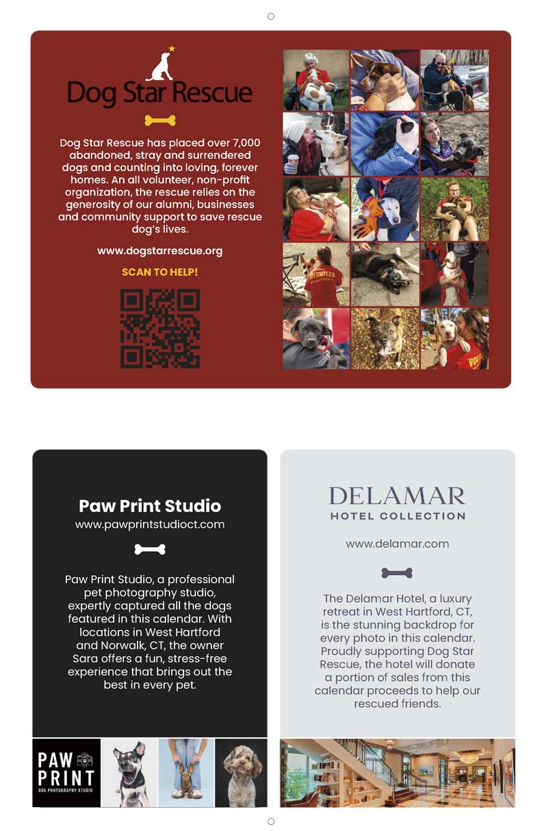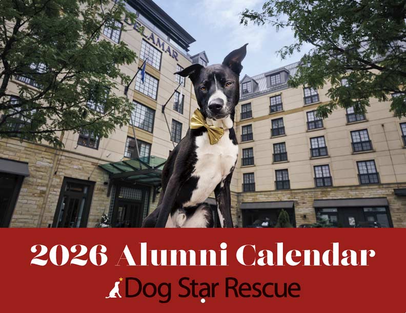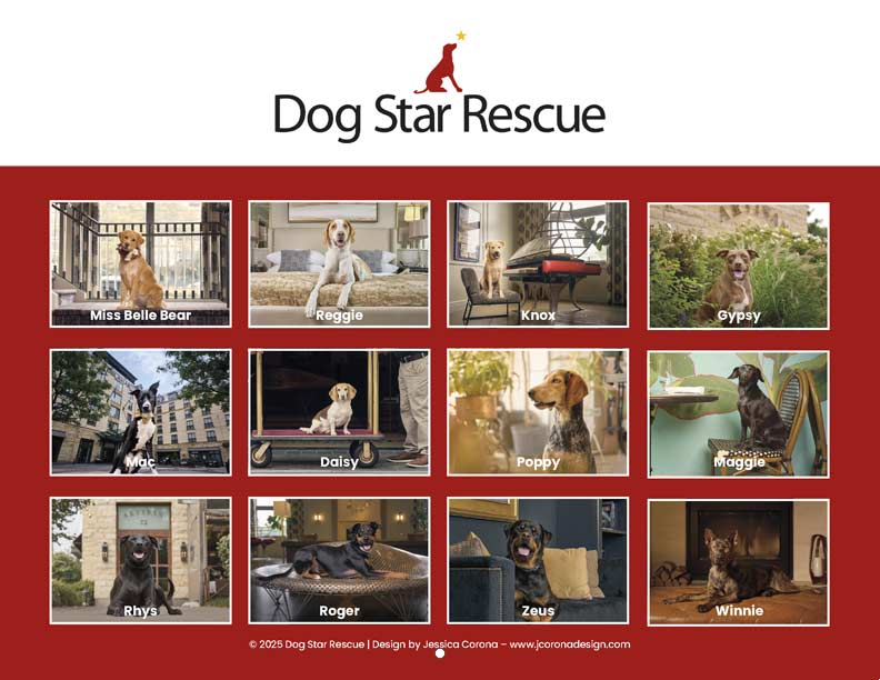 This 2026 Dog Star Rescue calendar features some of our thousands of treasured alumni, whose pawrents raised money for our rescue for a chance to be featured. All locations are at the luxurious Delamar Hotel in West Hartford CT, and all photographs were taken by the very talented Paw Print Studio. 100% of proceeds from this calendar's sales help support Dog Star Rescue, a non-profit, all-volunteer rescue, who has placed over 7,000 stray, abandoned, and surrendered dogs into loving, forever homes.