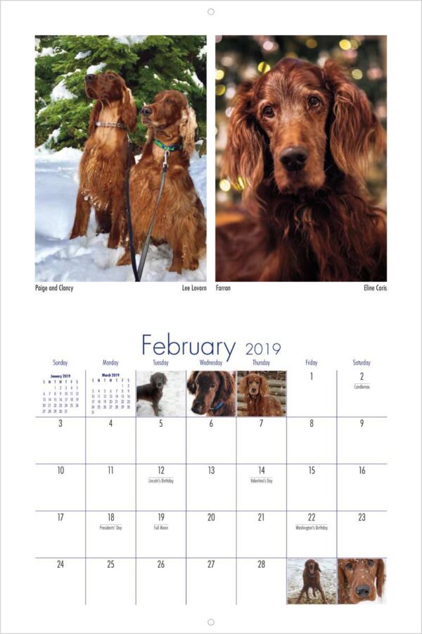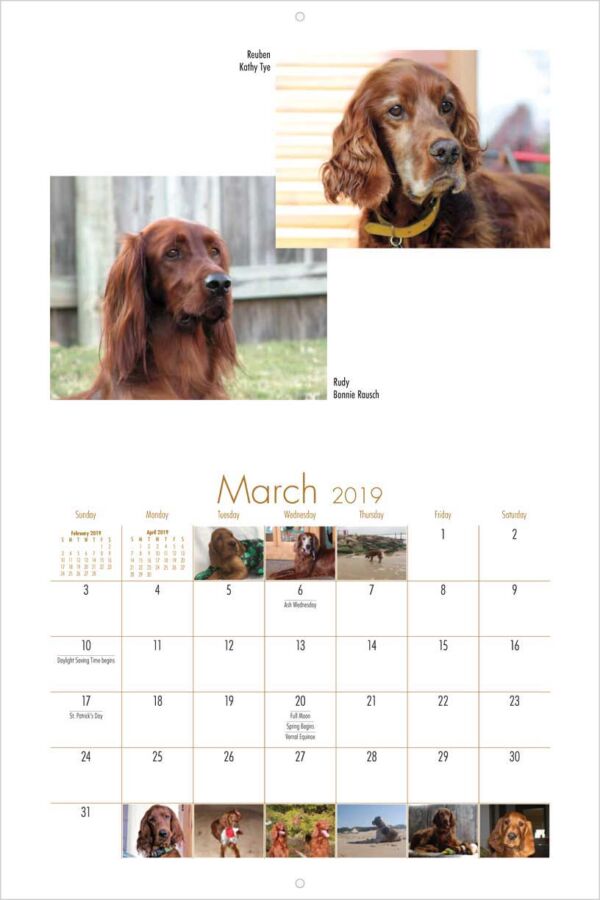 This 9" x 12", 13-month wall calendar was produced by the Irish Setter Lovers Facebook Group. All proceeds from the sale of the calendar support Save Our Setters a nonprofit organization dedicated to helping displaced Irish, Gordon, and Irish Red and White Setters.