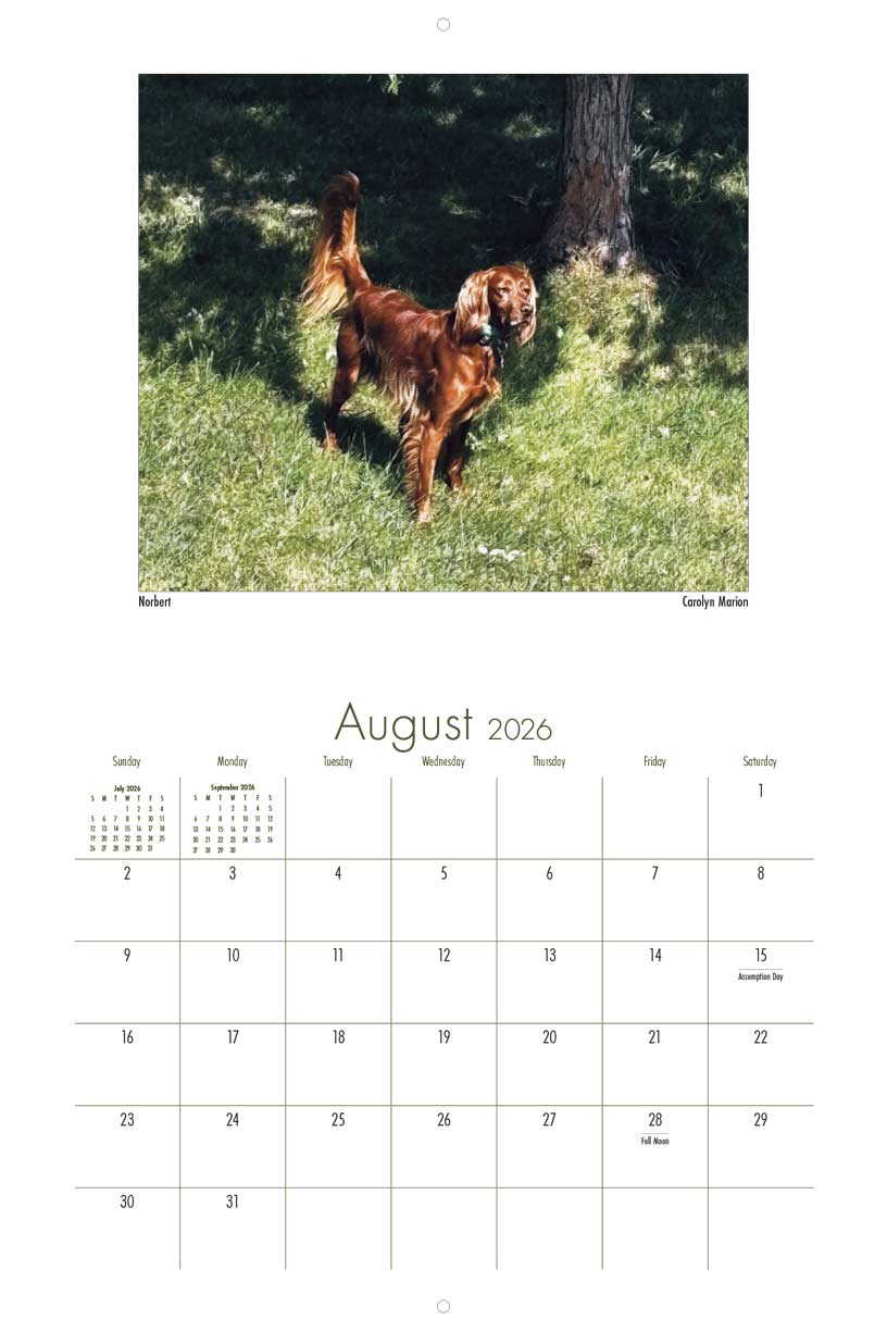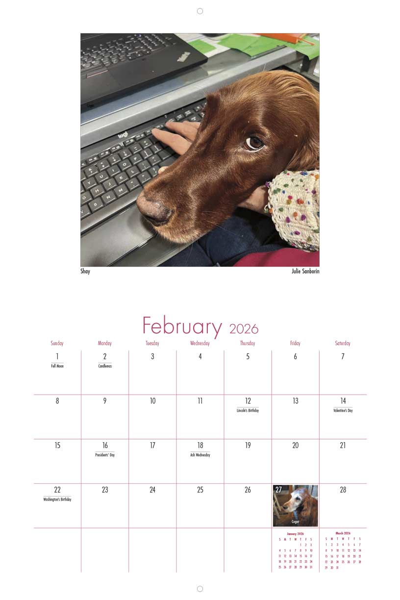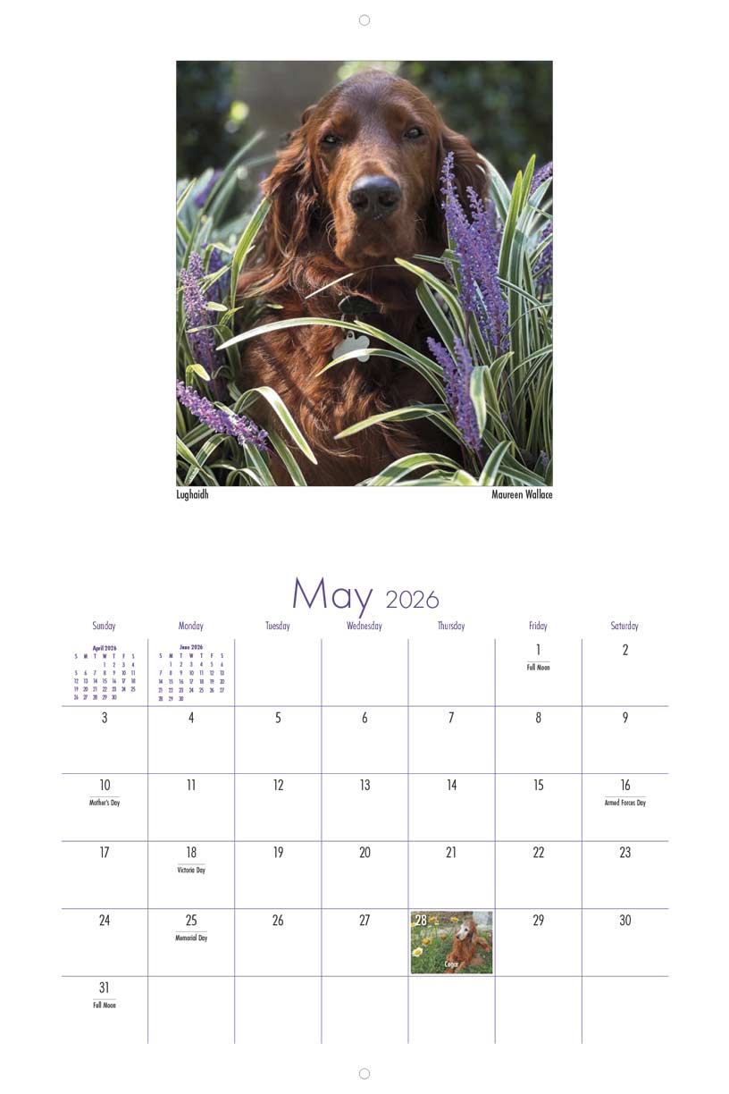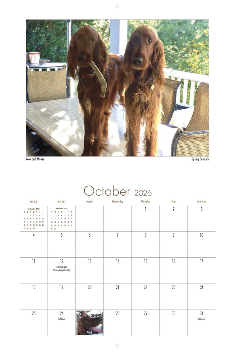 This 9" x 12", 13-month wall calendar was produced by the Irish Setter Lovers Facebook Group. All profits from the sale of the calendar support Save Our Setters a nonprofit organization dedicated to helping displaced Irish, Gordon, and Irish Red and White Setters.