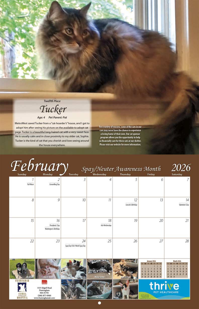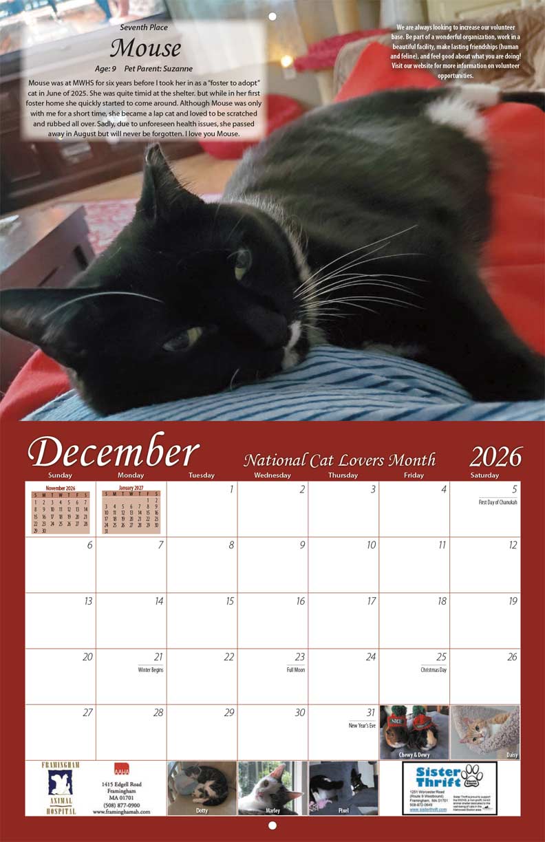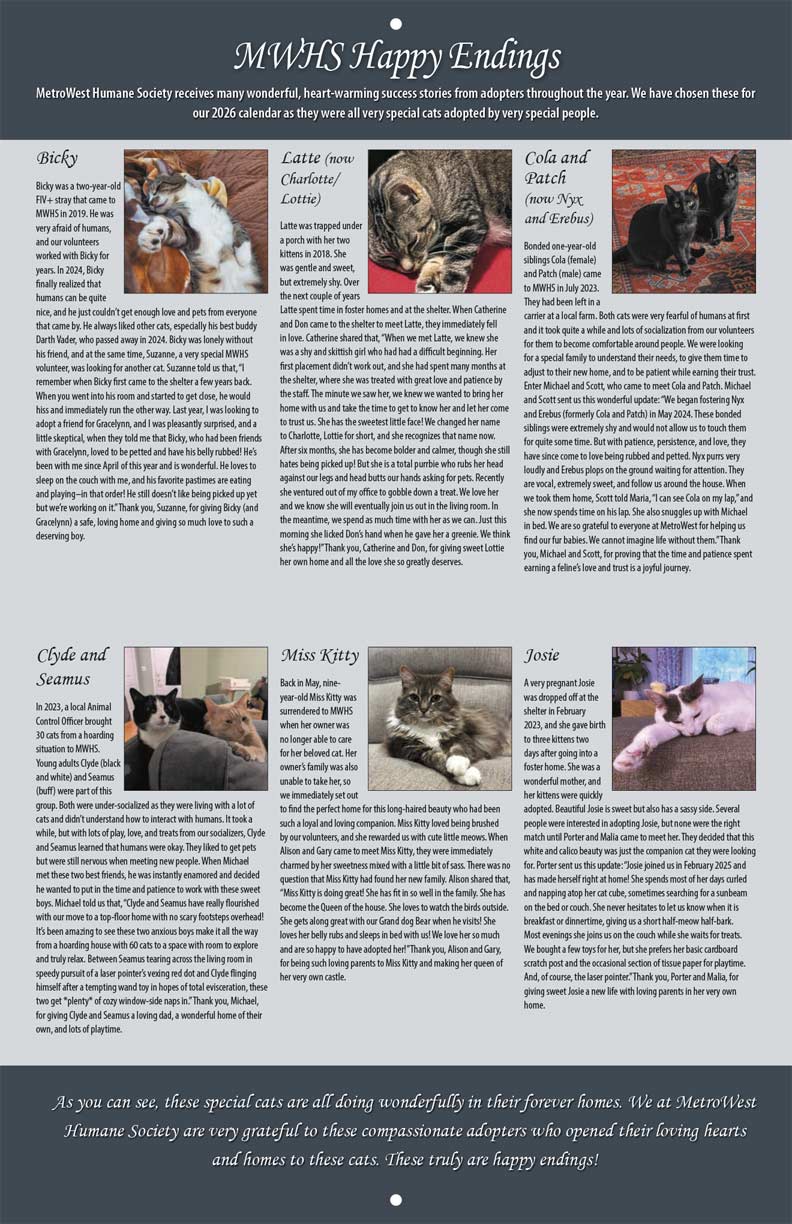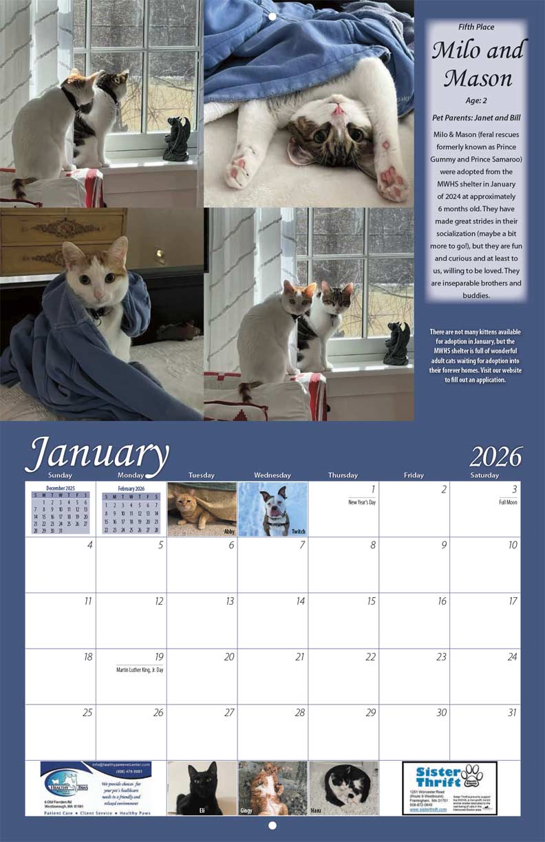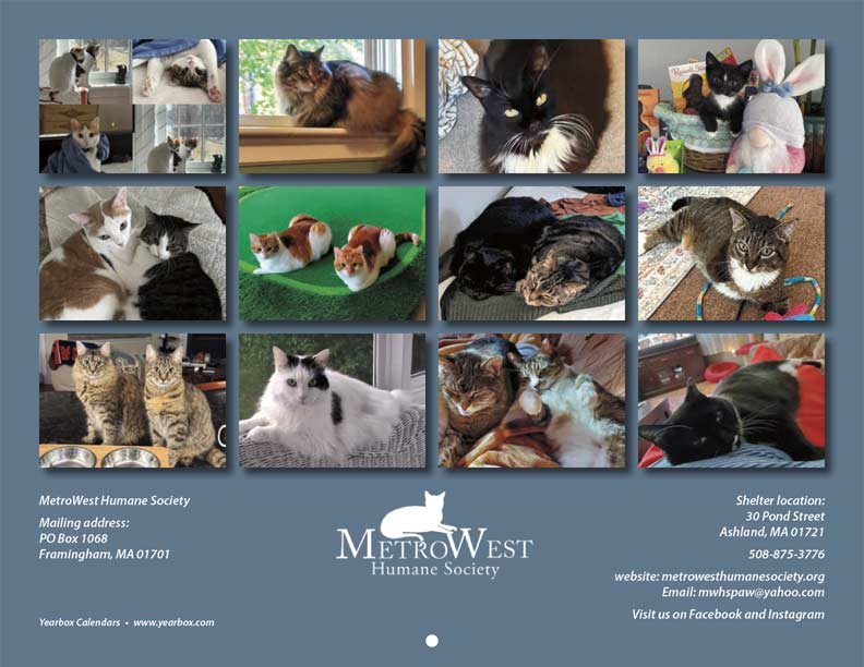 Thank you for supporting the MetroWest Humane Society with your calendar purchase! These calendars make great gifts, so be sure to stock up and take advantage of multiple quantity discounts. We are a non-profit, no-kill, volunteer-run shelter that relies entirely on donations and fundraisers, including profits from these calendars, to help the homeless cats in our care.