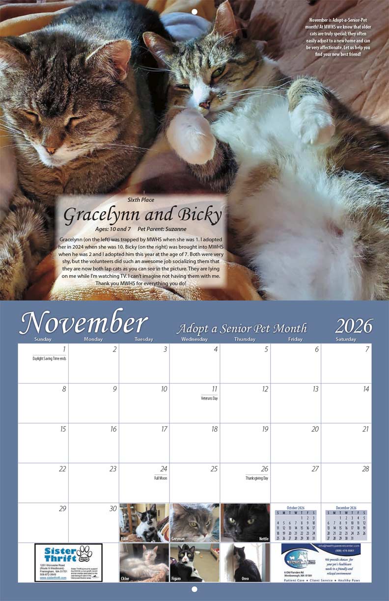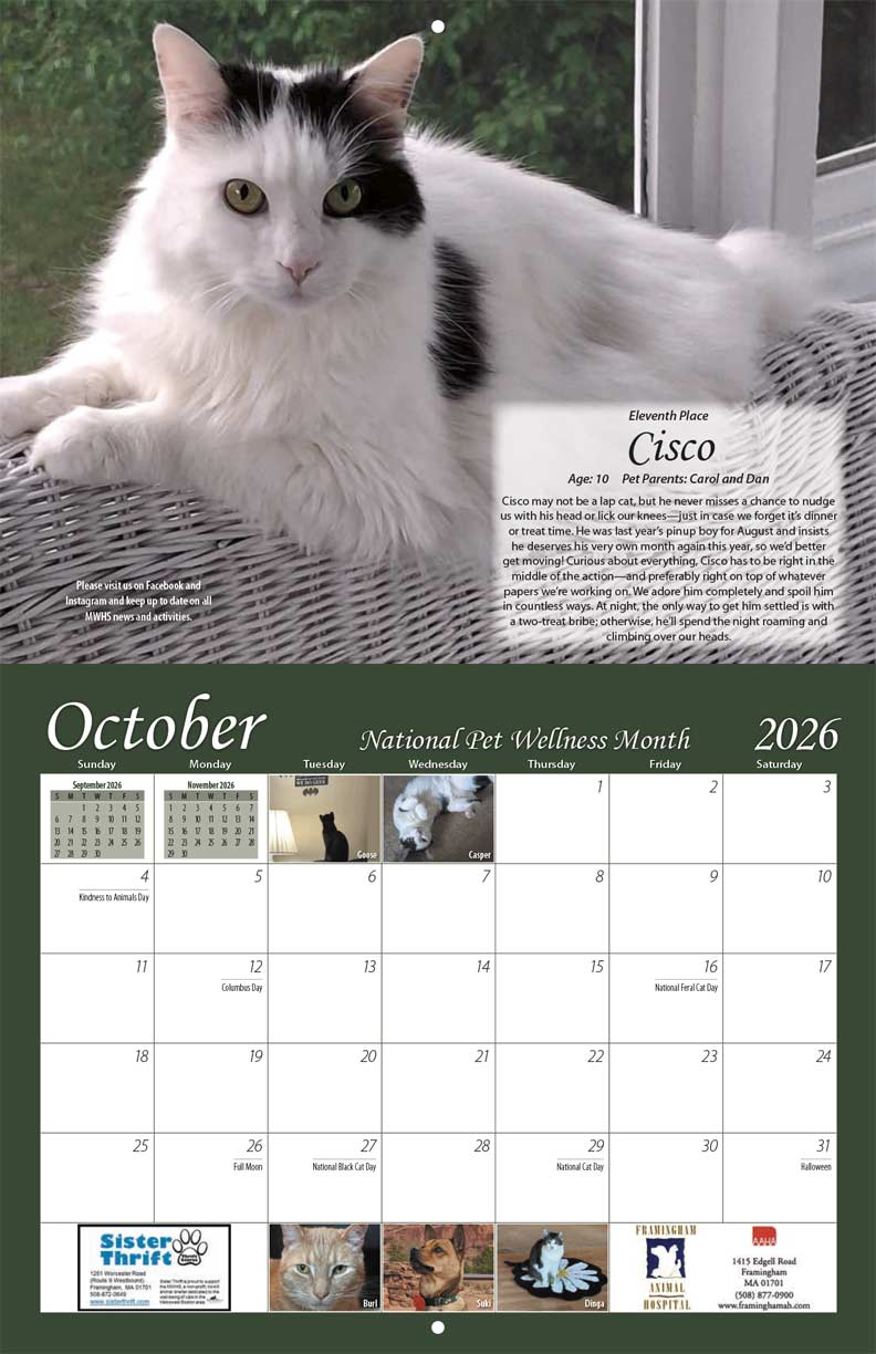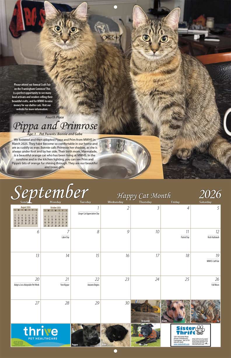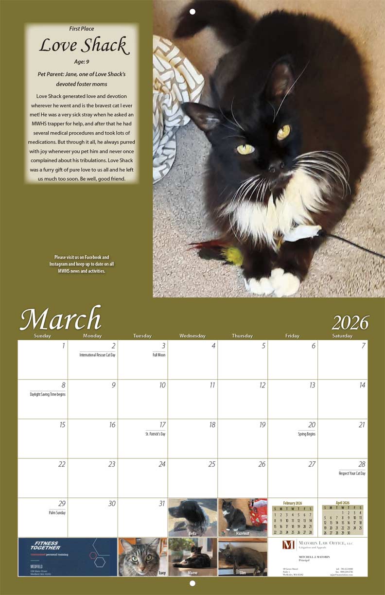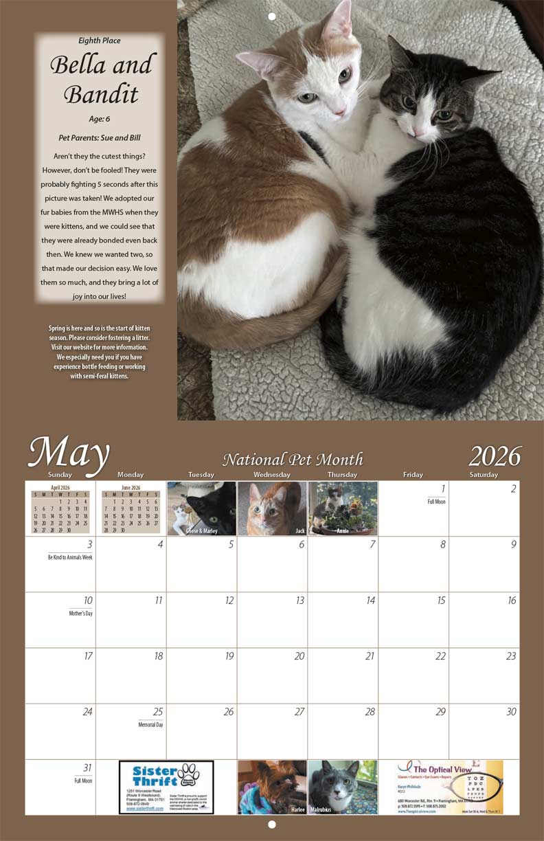 Thank you for supporting the MetroWest Humane Society with your calendar purchase! These calendars make great gifts, so be sure to stock up and take advantage of multiple quantity discounts. We are a non-profit, no-kill, volunteer-run shelter that relies entirely on donations and fundraisers, including profits from these calendars, to help the homeless cats in our care.
