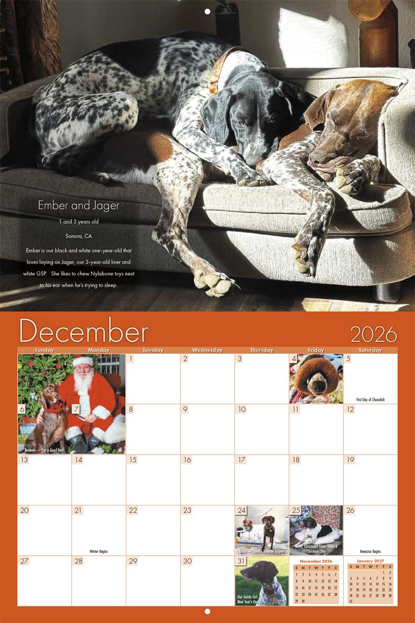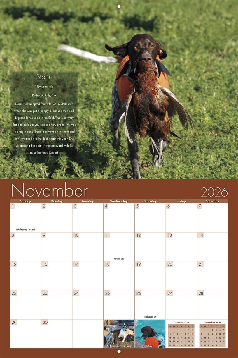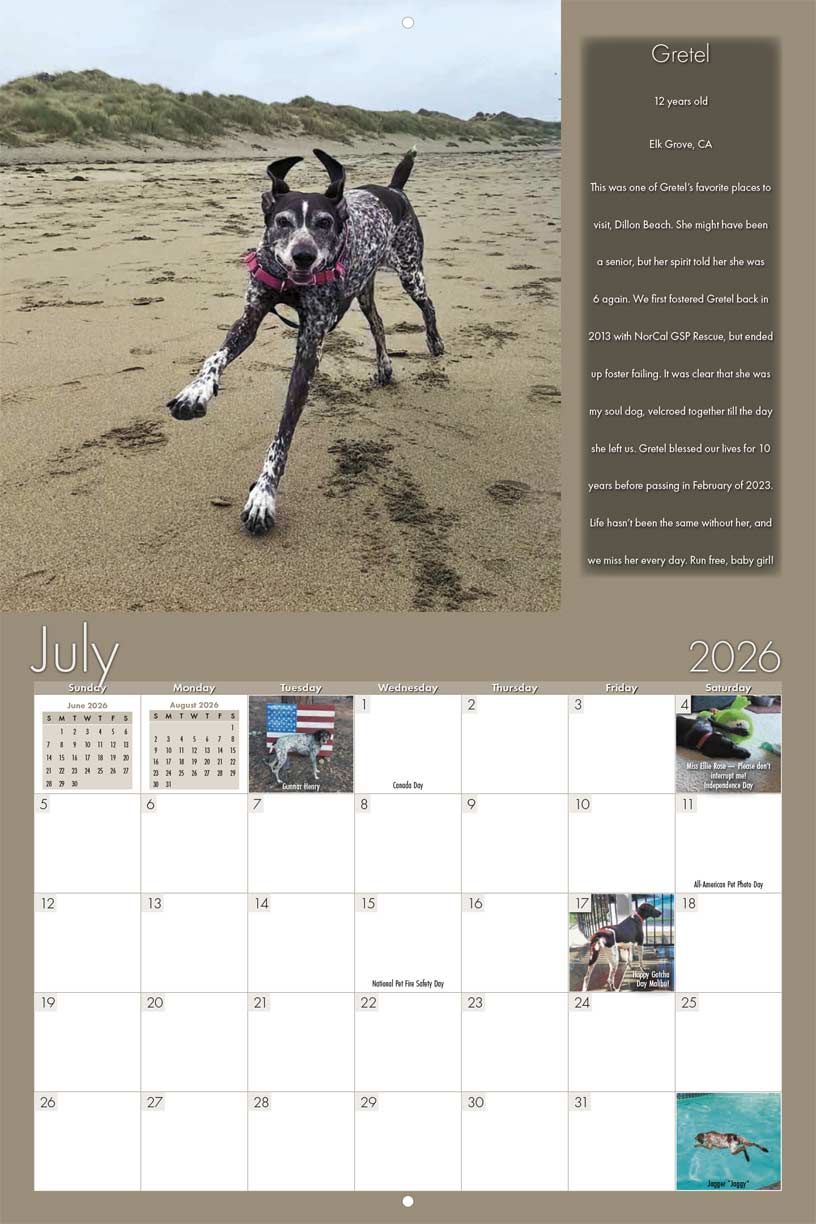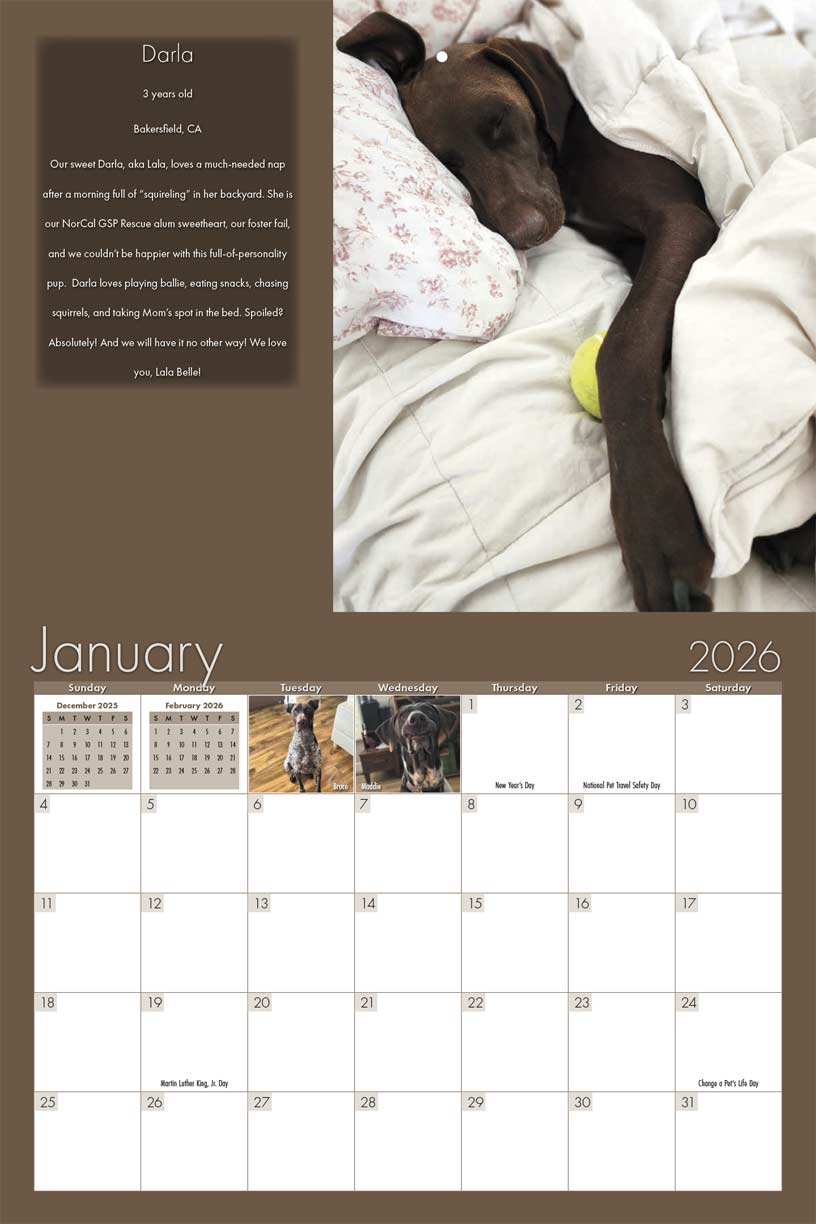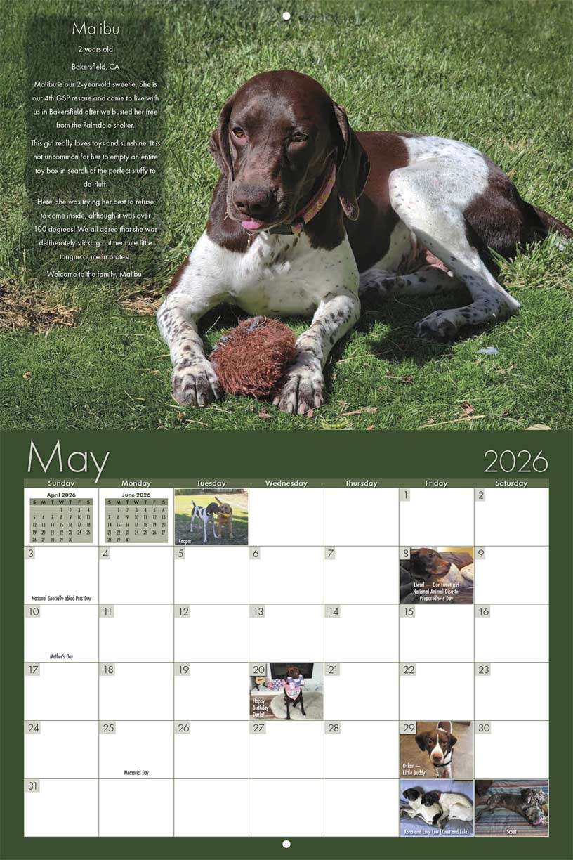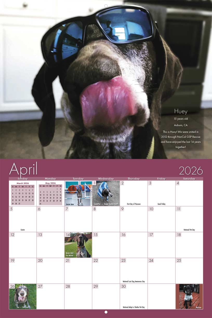 All proceeds from the sale of this 9" x 12" wall calendar support NorCal GSP Rescue, an all-volunteer, non-profit organization dedicated to placing unwanted and abandoned German Shorthaired Pointers in Northern California into new homes.