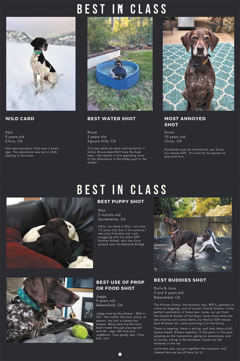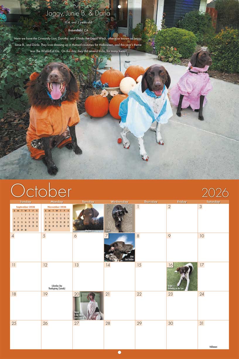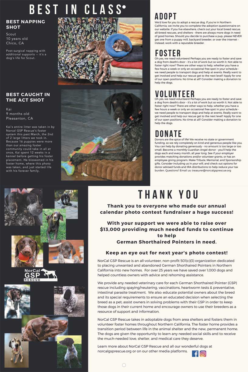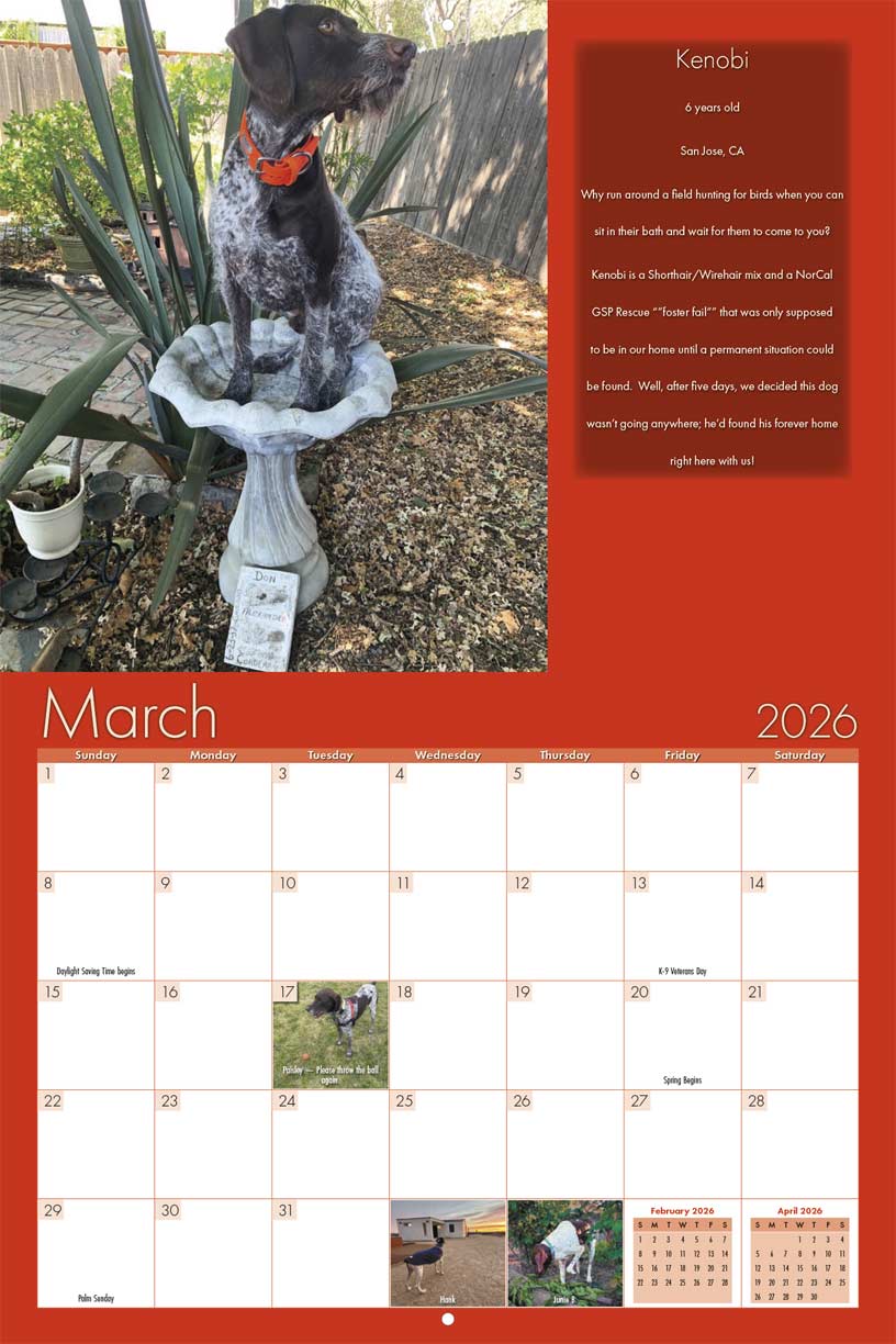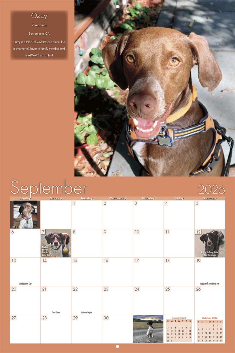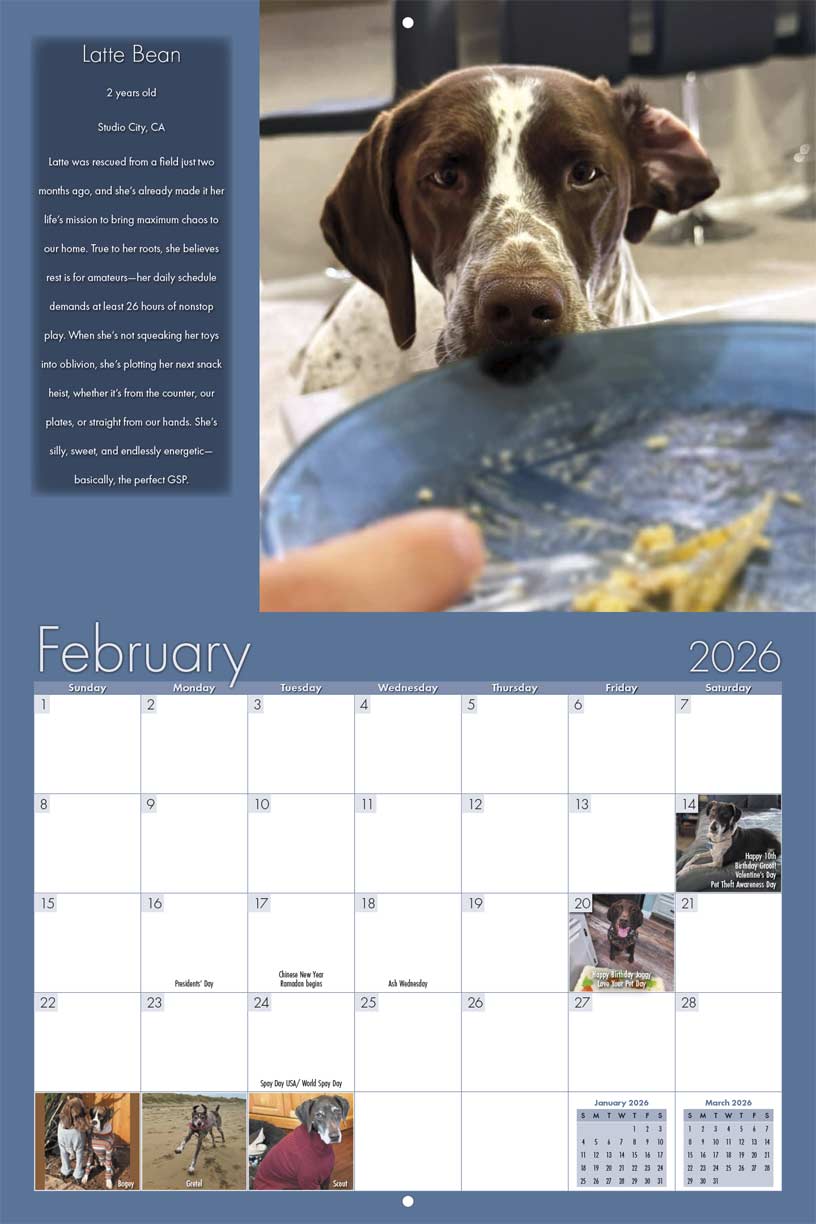 All proceeds from the sale of this 9" x 12" wall calendar support NorCal GSP Rescue, an all-volunteer, non-profit organization dedicated to placing unwanted and abandoned German Shorthaired Pointers in Northern California into new homes.