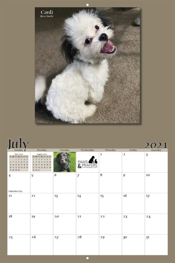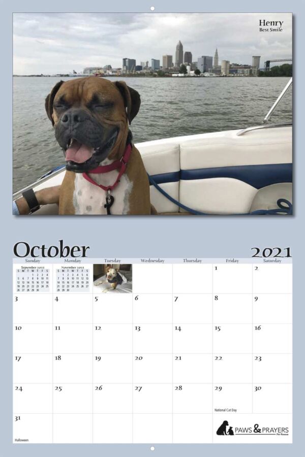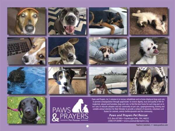 This 9″x12" wall calendar features beautiful photos of rescue pets. All proceeds from the sale of this calendar support Paws and Prayers Pet Rescue, Inc., a nonprofit organization whose mission is to rescue, rehabilitate and re-home displaced dogs and cats; to prevent overpopulation through spay/neuter; to restore dignity, trust and quality of life for neglected, abused and homeless dogs and cats; to find the best home for each dog and cat in our care; to educate adopters and our community on pet care, spaying/neutering, training and suitable animal selection for their lifestyle; to provide a network of resources, volunteers and fosters for animals, animal shelters/pounds and the community.