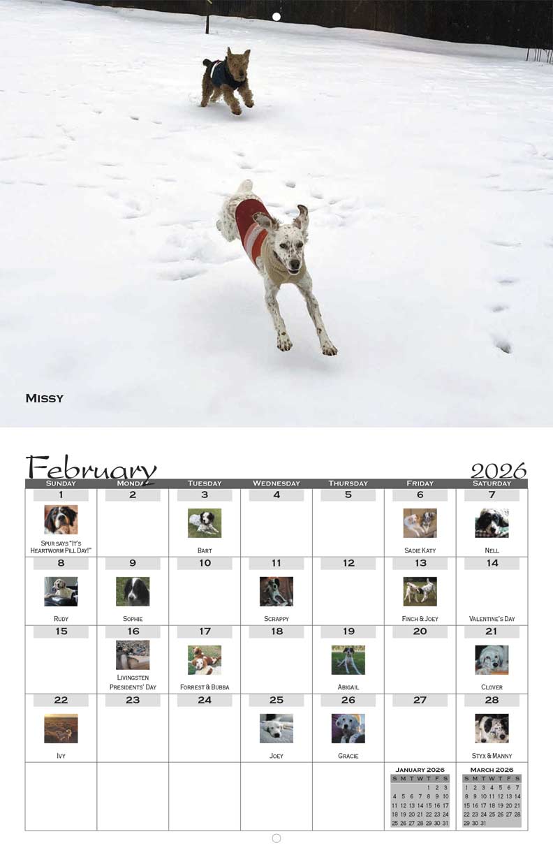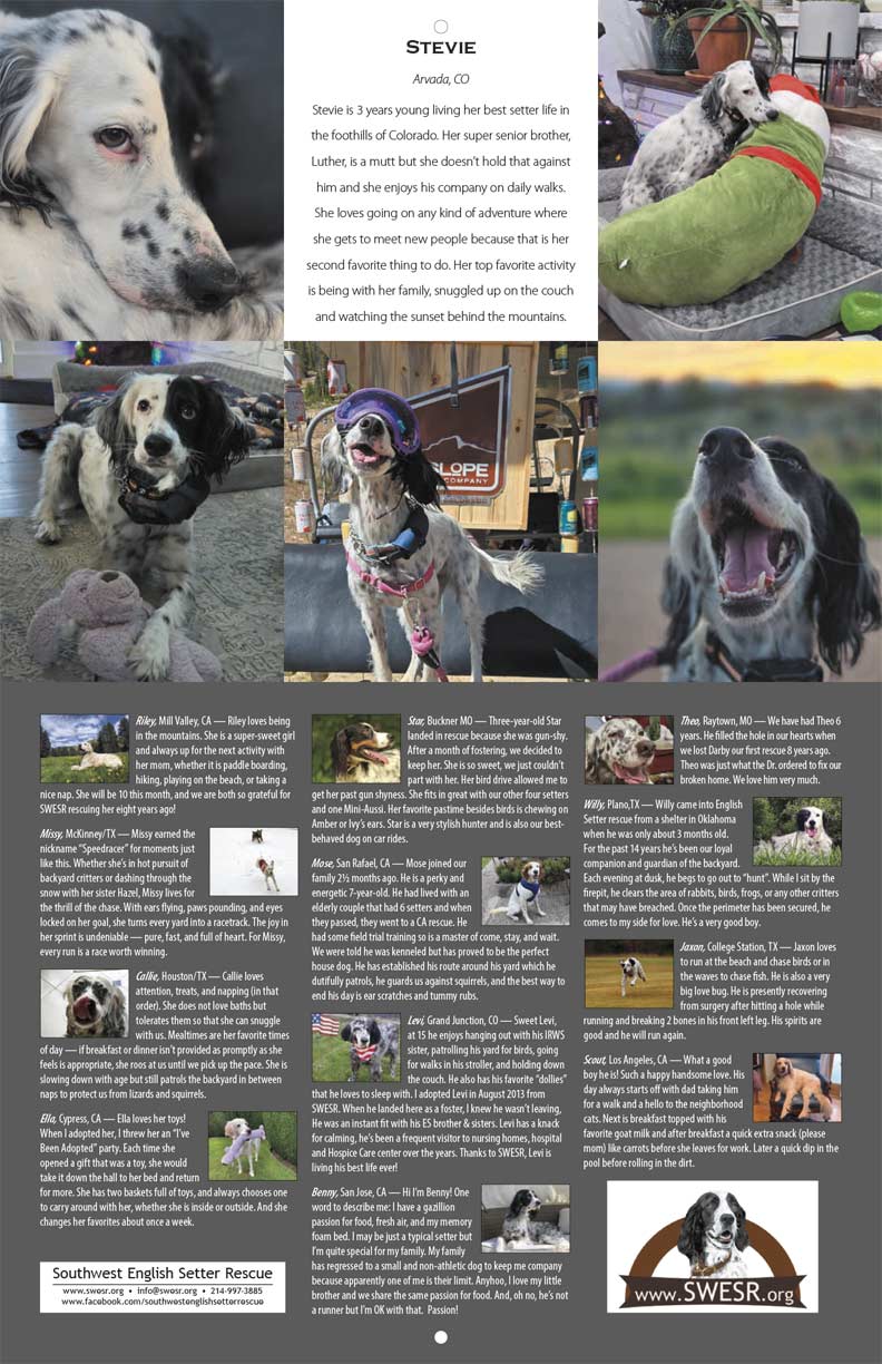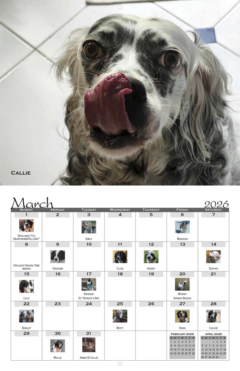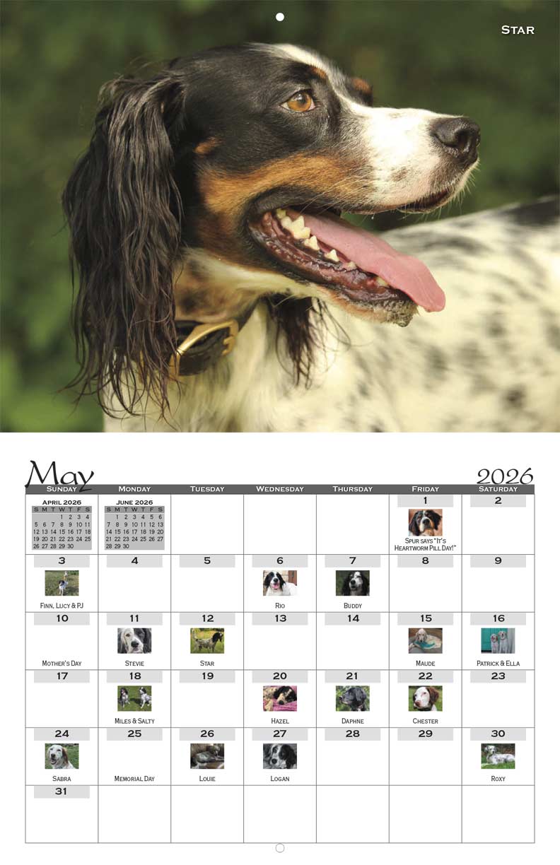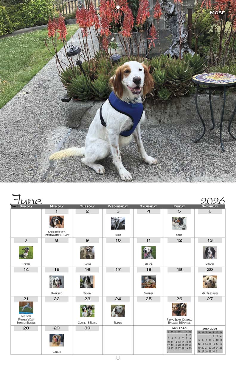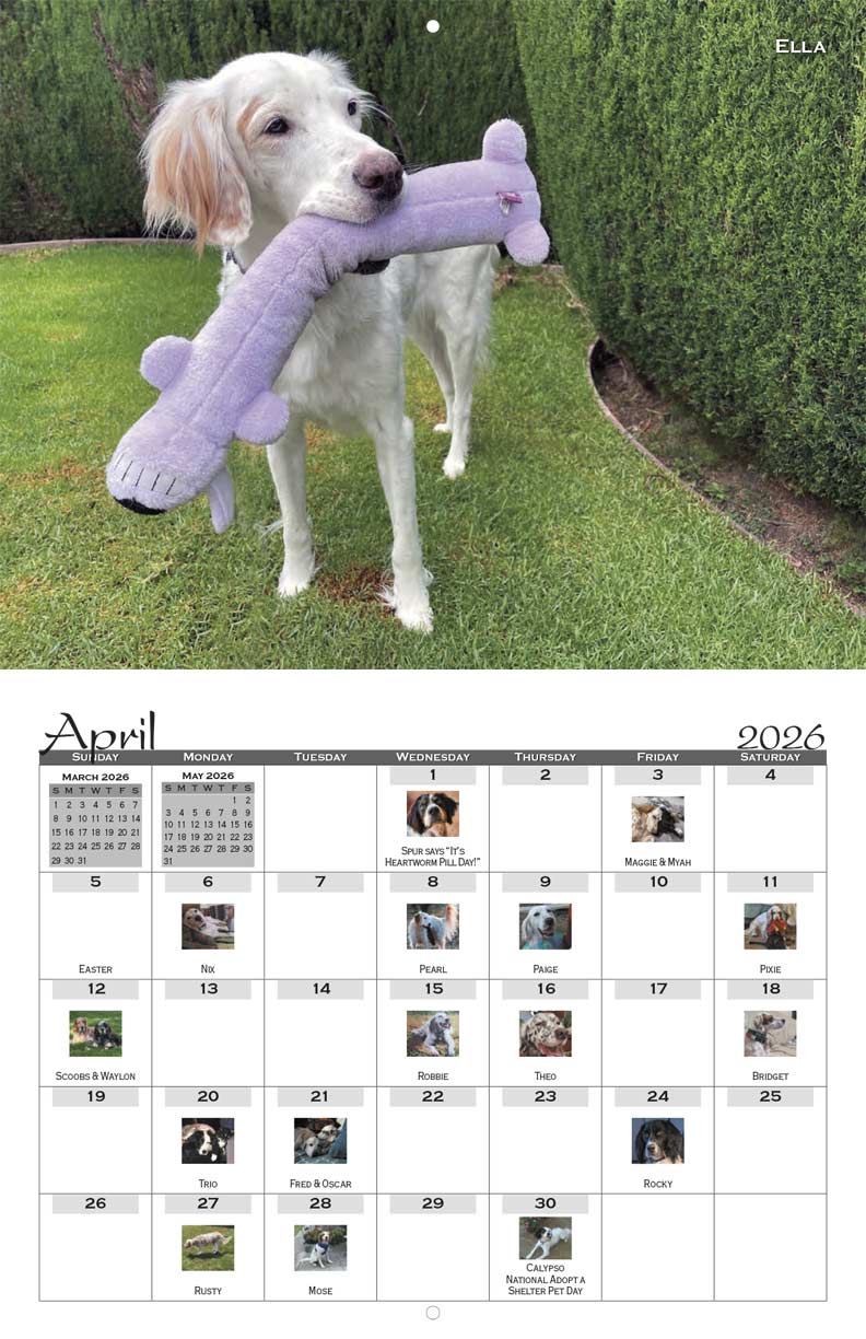 The SWESR 2026 Calendar features the top vote earners from the recent Setter Snapshots fundraising photo contest. Many of the beautiful dogs in the calendar were rescued and adopted through SWESR.