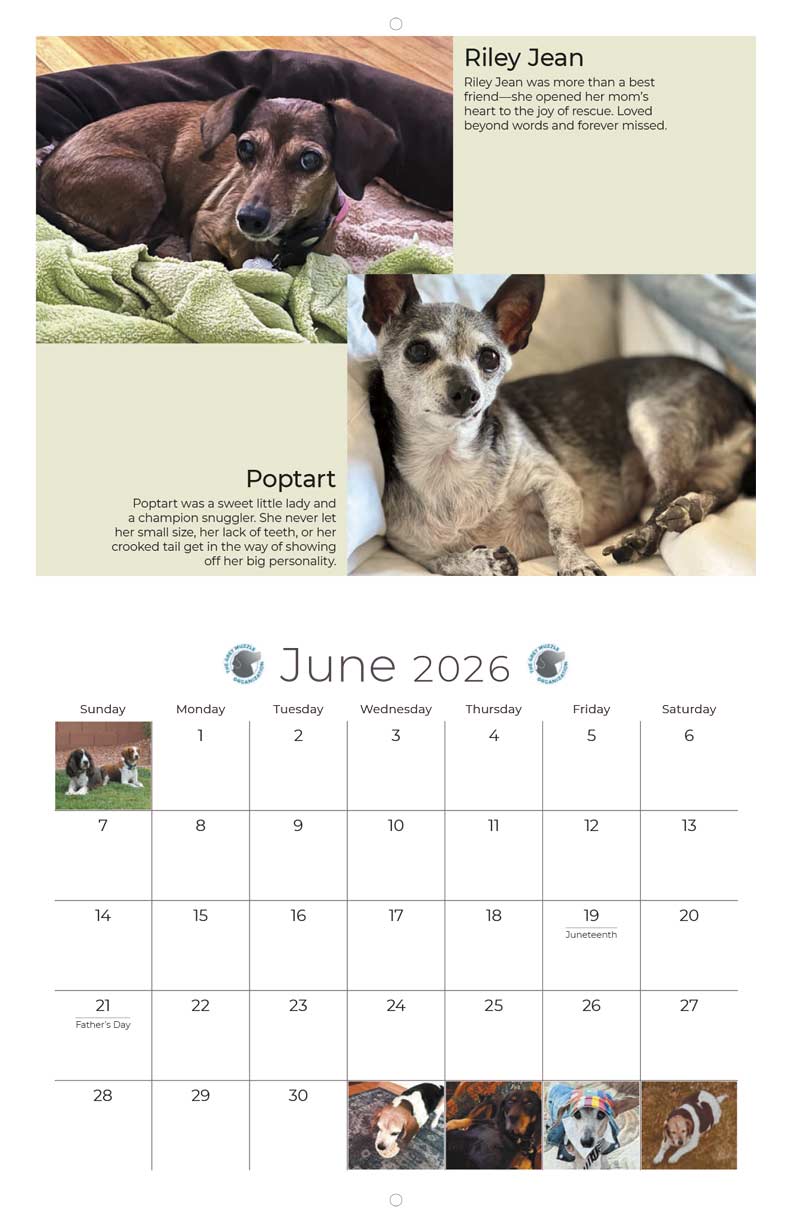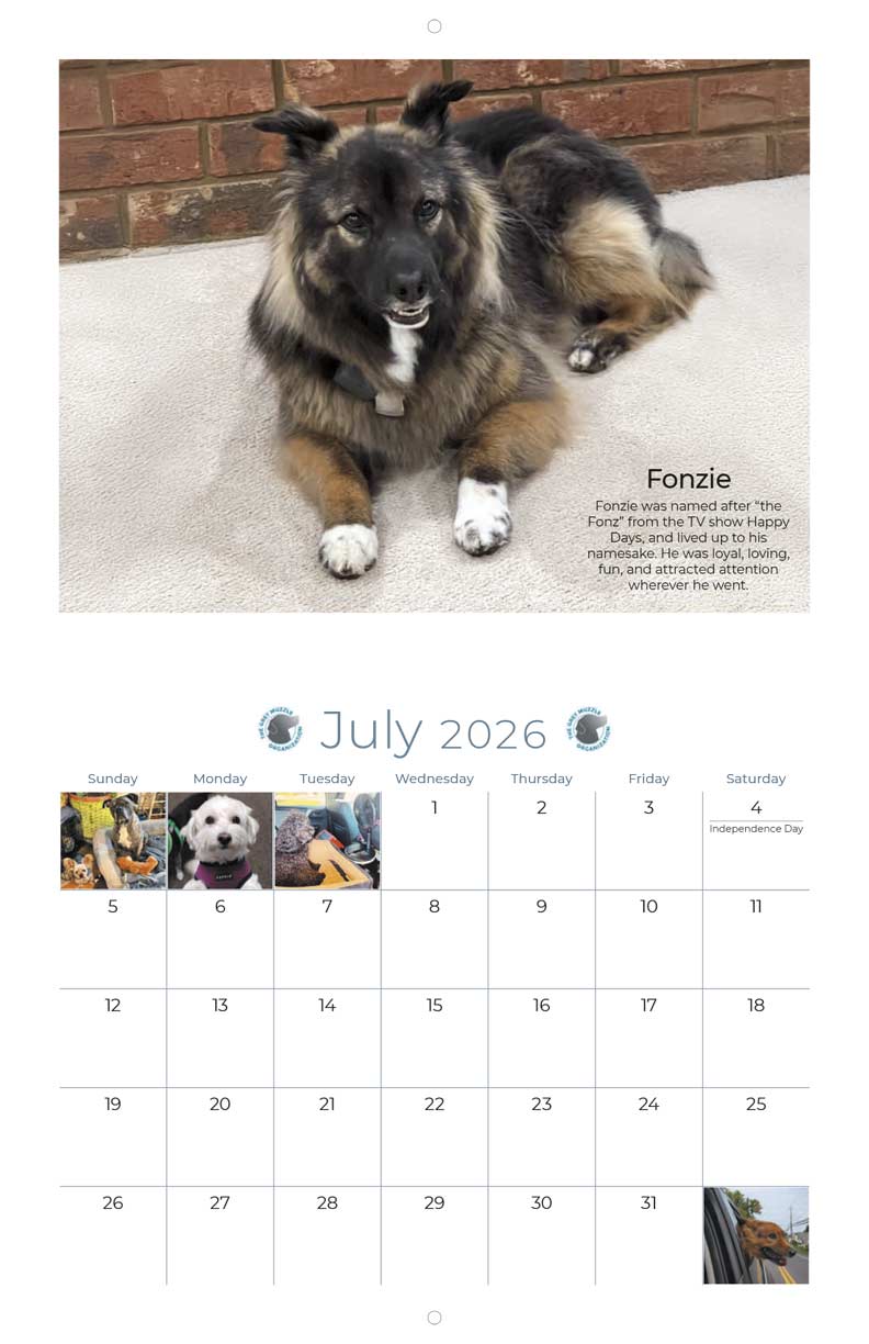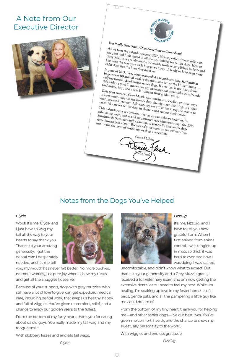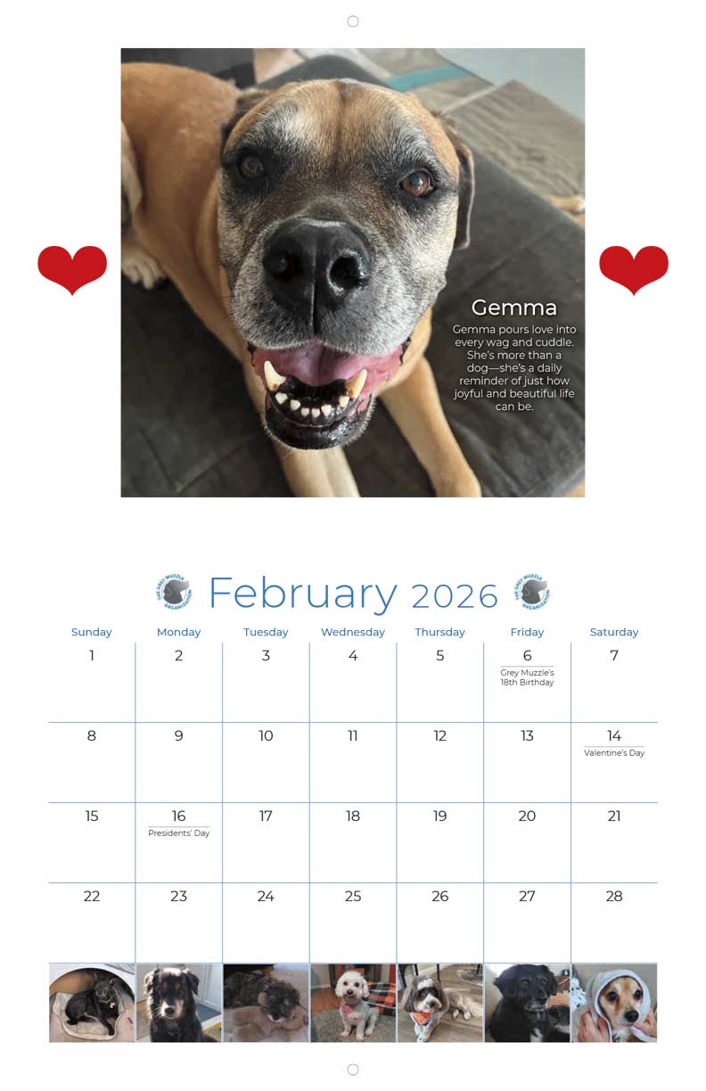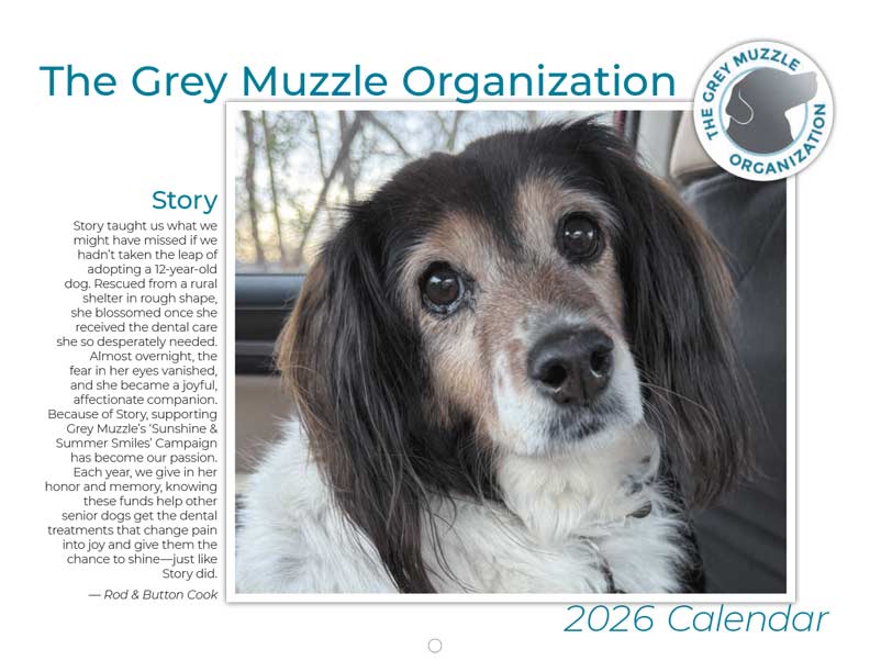 If a senior dog has ever warmed your heart or shared your home, this calendar is for you! The 2026 Grey Muzzle Calendar showcases dozens of heartwarming photos of beloved senior dogs—submitted by YOU during GMO's Sunshine & Summer Smiles Campaign. Each purchase helps transform the lives of senior dogs in need. Brighten every month with an adorable grey muzzle, and know your support is giving older dogs across the country the love and care they deserve.