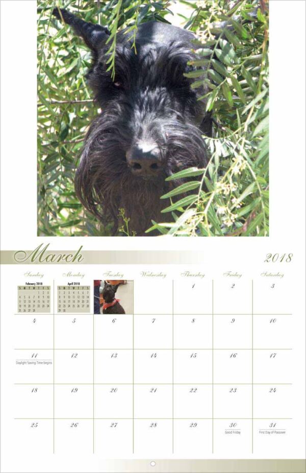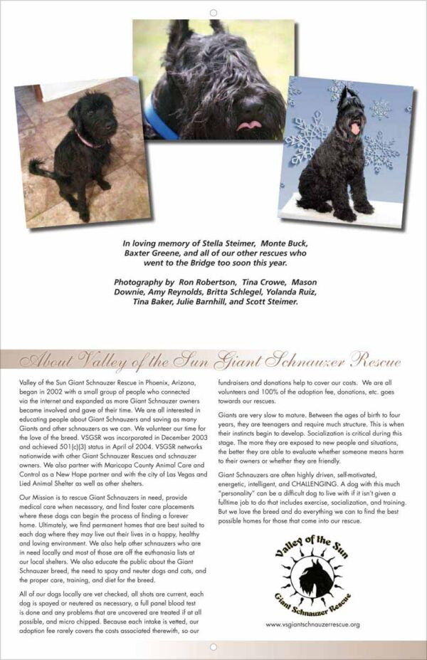 All proceeds from the sale of this 8-1/2″ x 11” wall calendar support Valley of the Sun Giant Schnauzer Rescue, a 501c(3) non-profit organization dedicated to rescuing, caring for, and finding homes for Giant Schnauzers and other schnauzers in need.