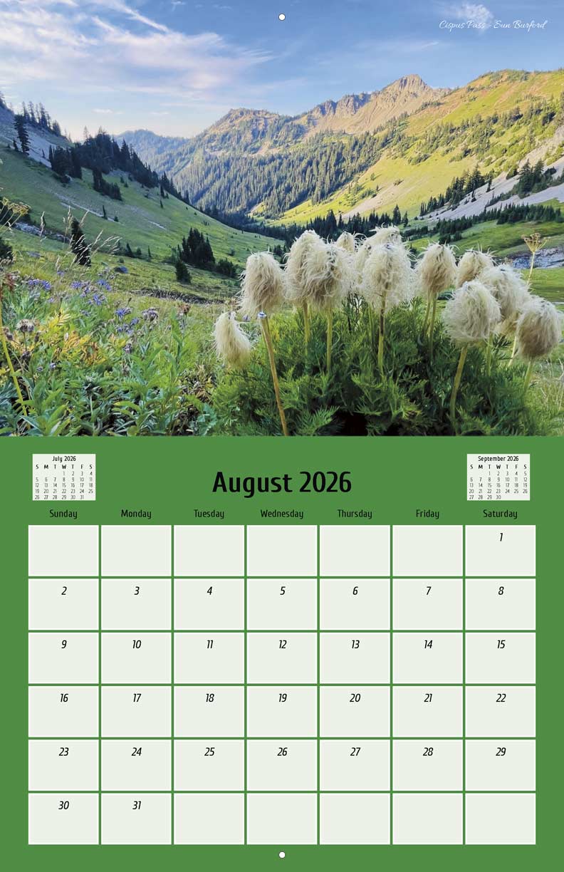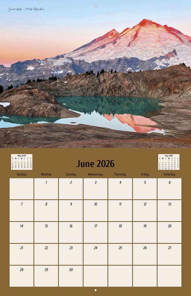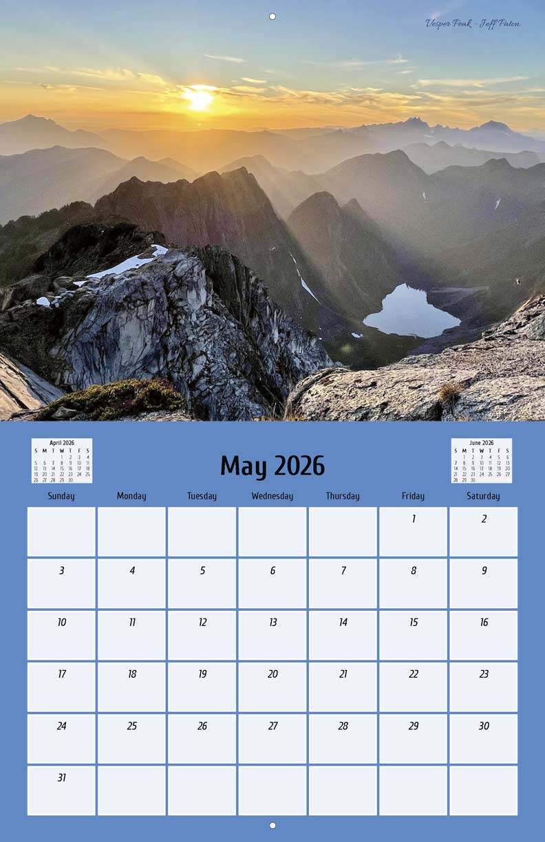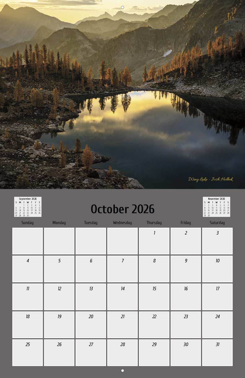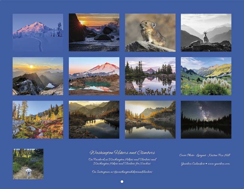 This beautiful 8.5"x11" wall calendar features stunning photos of Washington State's incredible backcountry selected by members of the Washington Hikers and Climbers group. Net proceeds will be donated to various Search and Rescue organizations throughout Washington state.